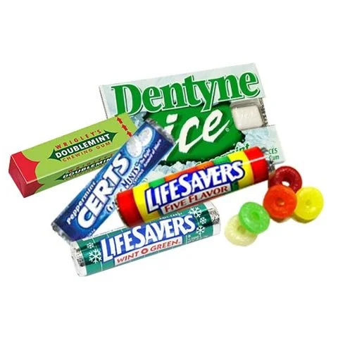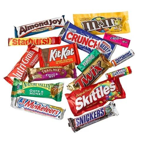 M & M's, Snickers, Milky Way, Almond Joy, Kit Kat, Reese's Peanut Butter Cup, Twix, Hersheys, Starburst, Skittles, Gummys, Mentos, Wrigley's, Orbitz