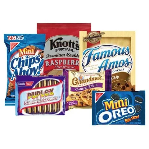Famous Amos, Oreo's, Cheez-its, Peanut Butter Crackers, Animal Crackers, Honey Grahams, Gold Fish